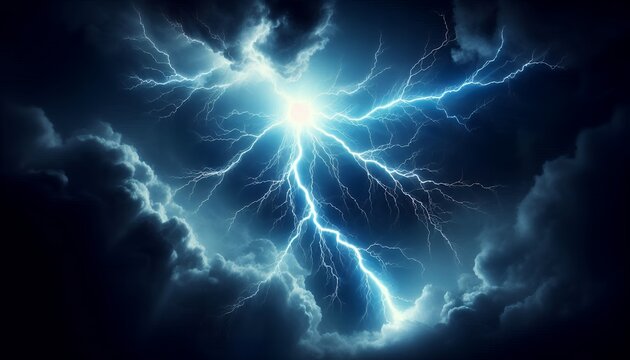 An abstract thunderstorm, with jagged lightning bolts cutting through dark clouds, casting electric blue light across the sky