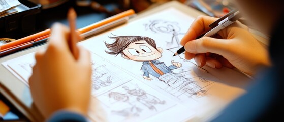 An artist skillfully sketches a lively character, bringing it to life with precise lines and vibrant creativity.