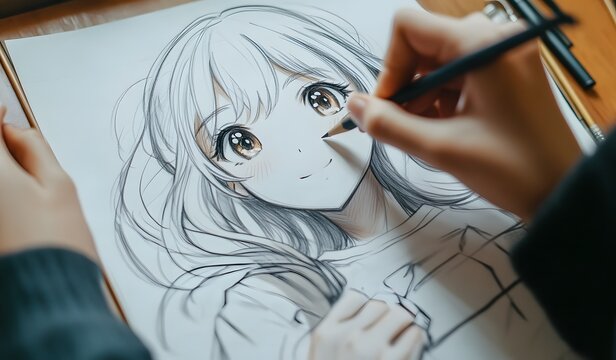A person drawing an anime girl with a pencil on paper, close-up of hands and sketching details. Anime art style.
