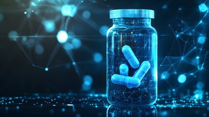 Plastic bottle with two abstract blue medical drug capsules. Healthcare medical and pharmacy concept. Low poly style. Geometric background Wireframe light connection structure Modern 3d graphic