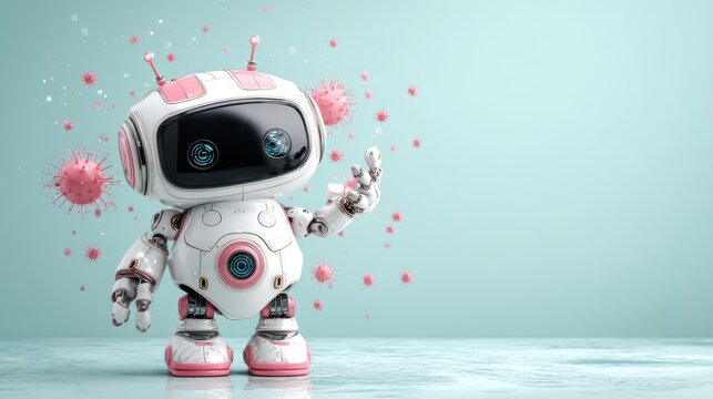A cute robot character stands against a light blue backdrop, surrounded by stylized virus illustrations, symbolizing health and technology, cute robot with space for text