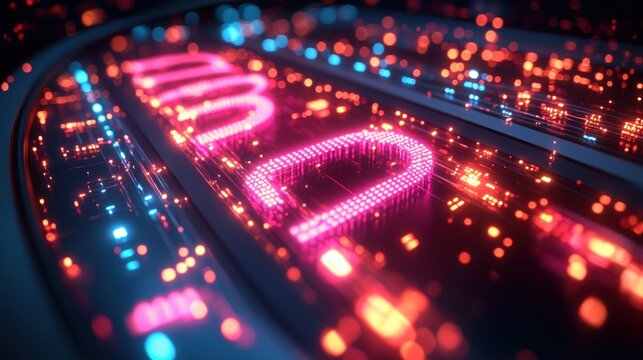 Abstract glowing text on a circuit board