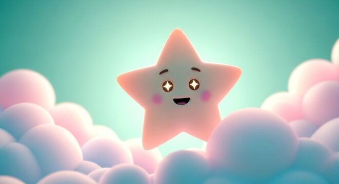 Smiling cartoon star with sparkling eyes floating in soft pink and white clouds
