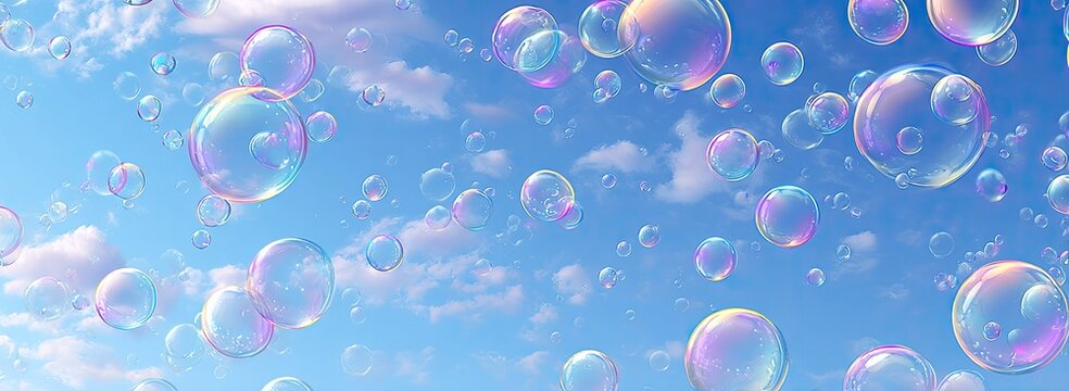 Colorful soap bubbles float in a vibrant blue sky filled with fluffy white clouds (2)