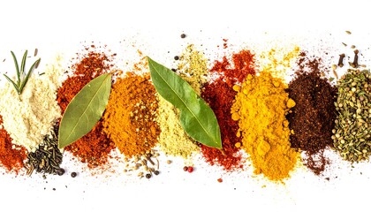 Assortment of vibrant spices and coarse salt on white background