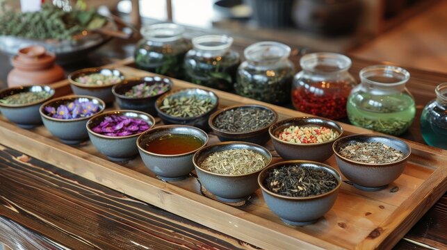 A variety of dried herbs and spices displayed in bowls and jars on a wooden tray, perfect for culinary and medicinal uses.