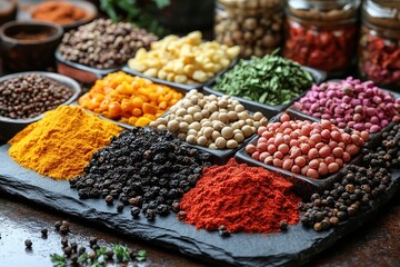 Colorful spices and herbs on slate, bowls, jars in kitchen