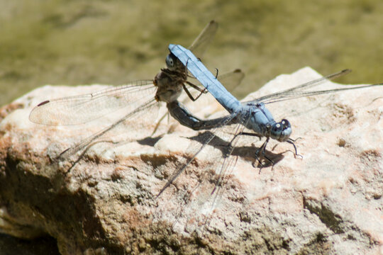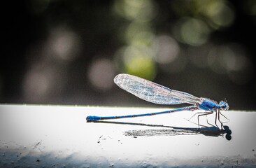 Silueta de Libélula escarlata ( Crocothemis erythraea ) con luz solar que le viene desde atrás en la fuente de Mariola, Bocairente, España