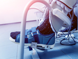 Therapist stretching lower leg and foot during rehabilitation session, backlit