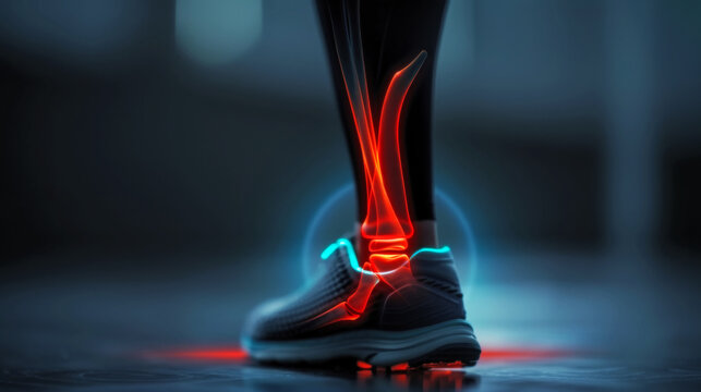 Close-up of a human ankle highlighting pain points with glowing lines, showcasing athletic footwear and dynamic movement.