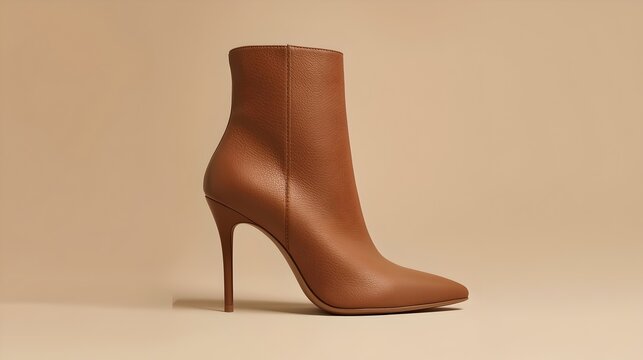 Tan stiletto ankle boot side profile, pointed toe, slender heel, sleek shape, elegant neutral style.