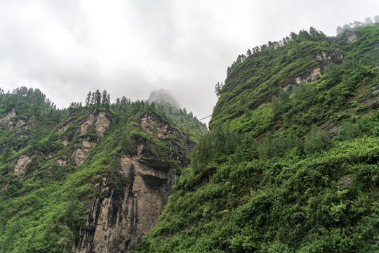 A high suspension bridge near the clouds above the main trail of the Annapourna Circuit