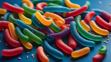 Colorful gummy worms on blue surface with sprinkles.