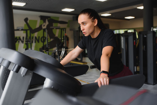 Portrait of a woman resting after her workout. She is leaning on a treadmill and looks completely exhuasted.