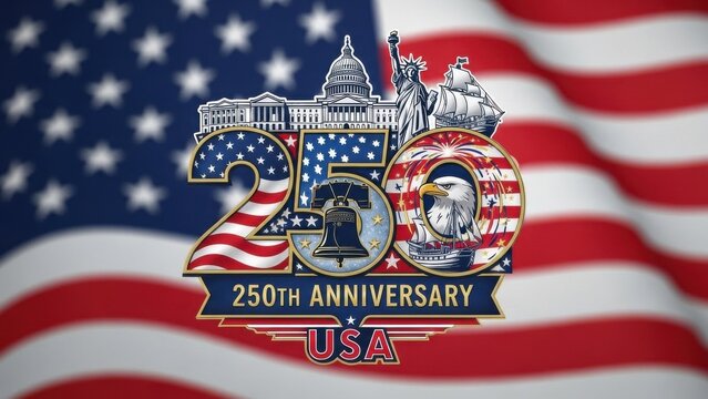 USA 250th anniversary logo featuring major American landmarks and symbols. Patriotic United States 2026 semiquincentennial celebration banner for independence day and history marketing.