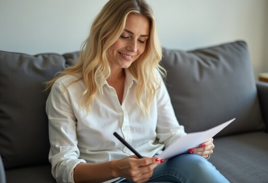 A blonde woman sits on a couch, happily reviewing and annotating documents with a pen.