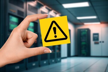 Exclamation mark or warning sign concept depicted on a yellow sticky note against a blue background with copy space image