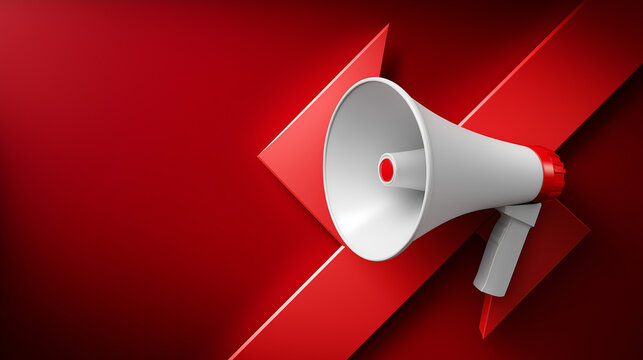 Dynamic megaphone announces urgent message, bold red graphic design, arrow shape element, call to action visualization, communication concept, with copy space