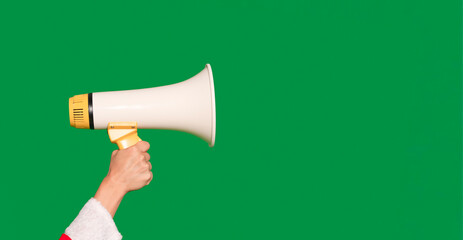Holiday celebration with festive spirit as a hand holding a megaphone announces joyful messages on a vibrant green background