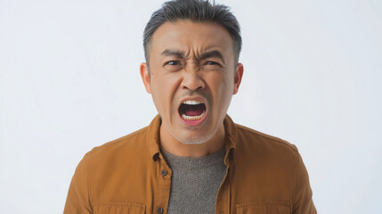Mad nervous middle-aged Asian man shouting, angry irritated Chinese male person, exasperated Japanese guy with frowning, upset unhappy face expression, aggressive guy isolated on white background