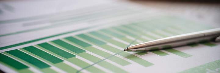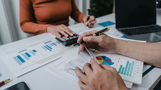 Manager working  with finance charts graph and doing annual analytic research document at office