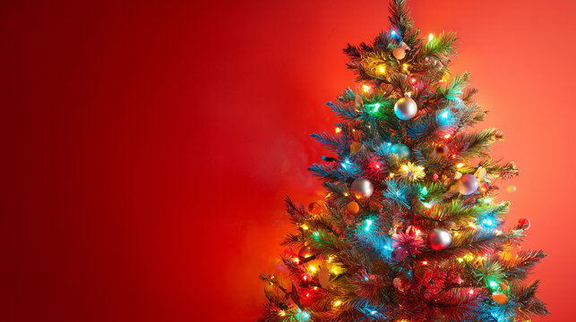 árvore de natal iluminada com luzes coloridas sobre fundo vermelho sólido, decoração festiva minimalista com espaço para texto, conceito de férias de fim de ano e promoções sazonais