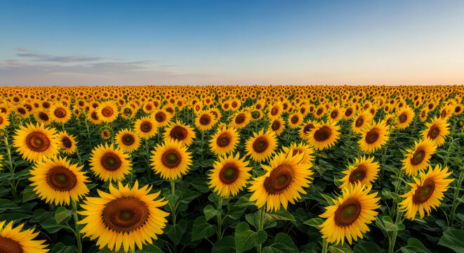 A vast field of sunflowers stretches to the horizon under a clear blue sky at golden hour light