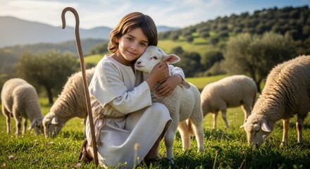 Child Jesus Christ, gentle shepherd, embraces beloved lamb, holding his wooden crook in a serene, verdant pasture with calm grazing sheep, bathed in divine light.