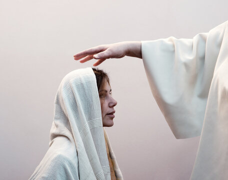 Blessing hand above the head of a woman in a headscarf