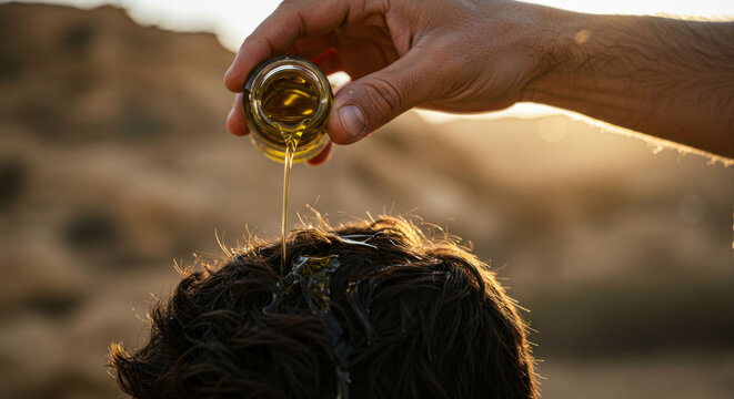 Man's hand anointing male head with holy oil from small jar concept of coronation. Biblical old testament story.