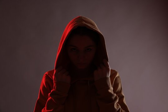 Anonymity. Woman wearing mask on dark blue background in red light, space for text