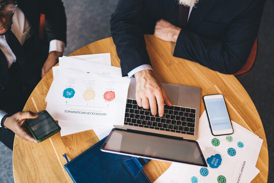 Crop colleagues sitting at table and working on laptop and papers at workplace