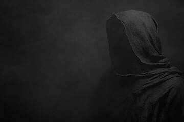 mysterious figure cloaked in dark hooded garment blending into shadowy background evoking a sense of enigma and solitude