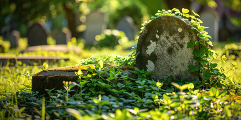 An abandoned old tombstone overgrown with greenery. Eternal memory, the need to remember, the importance of the past.