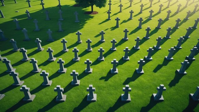 Cemetery for soldiers featuring concrete headstones on a grassy lawn.