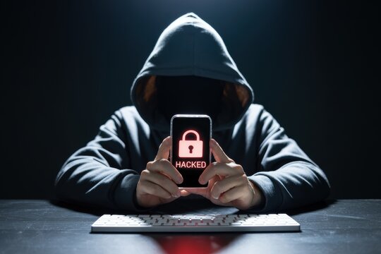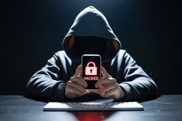 A hooded person sitting in a dark room holding a smartphone with a hacked lock screen in front of a computer keyboard