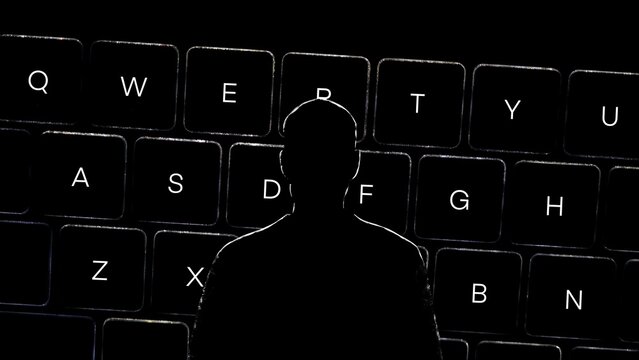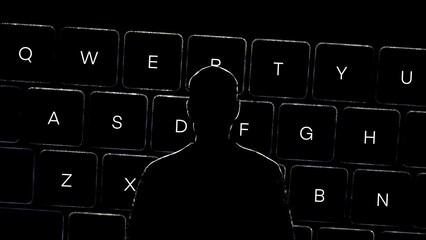 Dark silhouette of a hacker, dark keyboard with white backlight