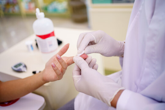 Unrecognizable pharmacist in gloves checking blood of anonymous lady customer in pharmacy