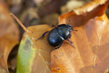 Forest dung beetle seen from above among brown leaves, close-up Forest dung beetle among brown leaves, its body glistening, Forest dung beetle shimmers blue in the light, Anoplotrupes stercorosus