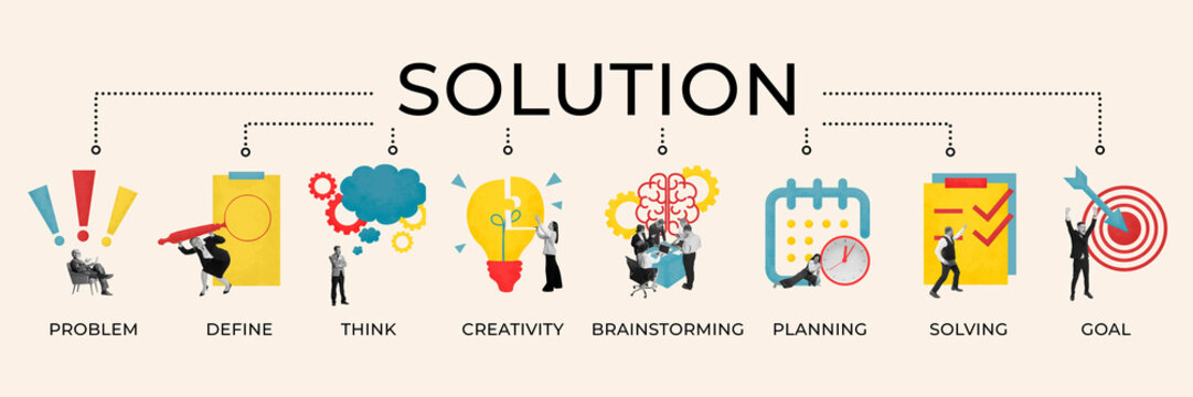 Visual of solution process with stages. Problem, Define, Think, Creativity, Brainstorming, Planning, Solving, and Goal, each illustrated with engaging graphics. Concept of business idea, creativity.