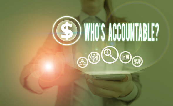 Text sign showing Who S Accountable. Business photo showcasing answerable for something within one power or control