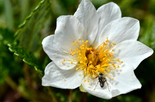 Macro of white Dryas (Dryas octopetala) with dewdrop on the petals and a ant in the French Alps at La Plagne, Savoie department.