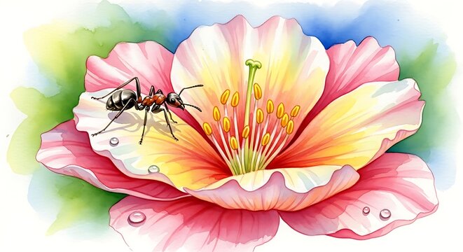 Ant Walking on Rose Petal Covered in Dewdrops in Sunlight