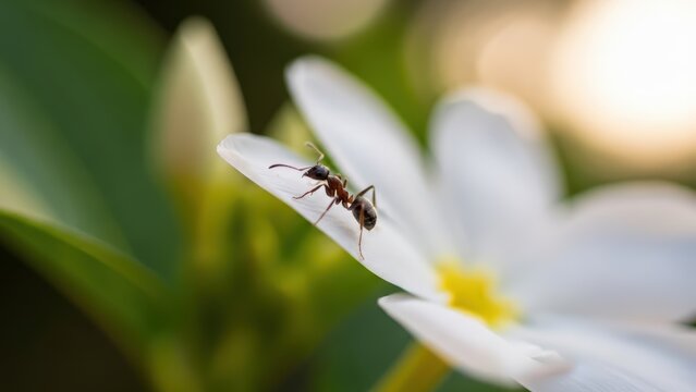 A tiny ant walks across a delicate white flower petal with a yellow center, captured in a close-up shot.