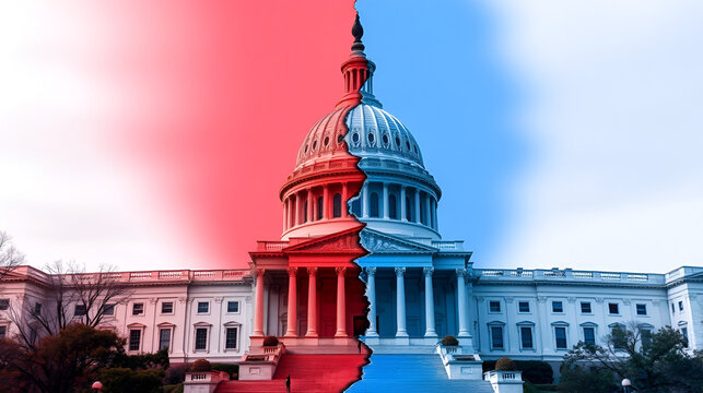The Capitol stands divided by a bold red and blue split, its jagged separation reflecting the tension and polarization shaping the nation today.