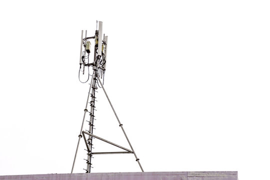 Hooded crow perching and pecking satellite dish on urban rooftop with antennas and cables