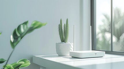 Modern Wifi Router With Antennas Next To Cactus On Bright White