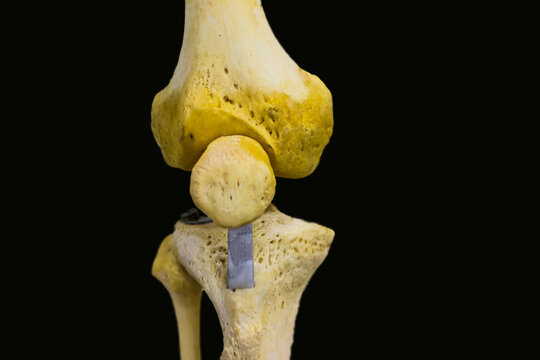 antero posterior view of articulated femur tibia fibula patella bones showing human knee joint anatomy in isolated black background with space for text