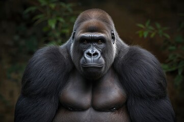 Beautiful Portrait of a Gorilla. Male gorilla on black background, severe silverback, anthropoid ape.