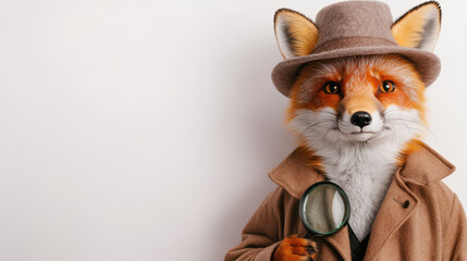 charming fox dressed as detective wearing trench coat and hat